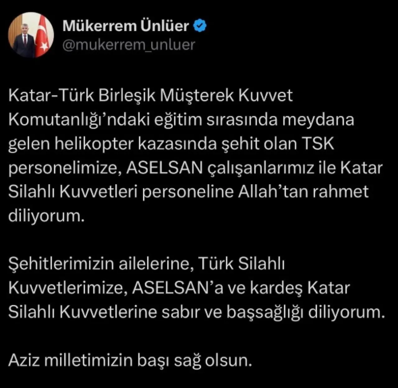 “Katar-Türk Birleşik Müşterek Kuvvet Komutanlığı’ndaki eğitim sırasında meydana gelen helikopter kazasında şehit olan TSK personelimize, ASELSAN çalışanlarımıza ve Katar Silahlı Kuvvetleri personeline Allah’tan rahmet diliyoruz. Şehitlerimizin ailelerine, Türk Silahlı Kuvvetlerimize, ASELSAN’a ve kardeş Katar Silahlı Kuvvetlerine sabır ve başsağlığı diliyoruz. Aziz milletimizin başı sağ olsun.”