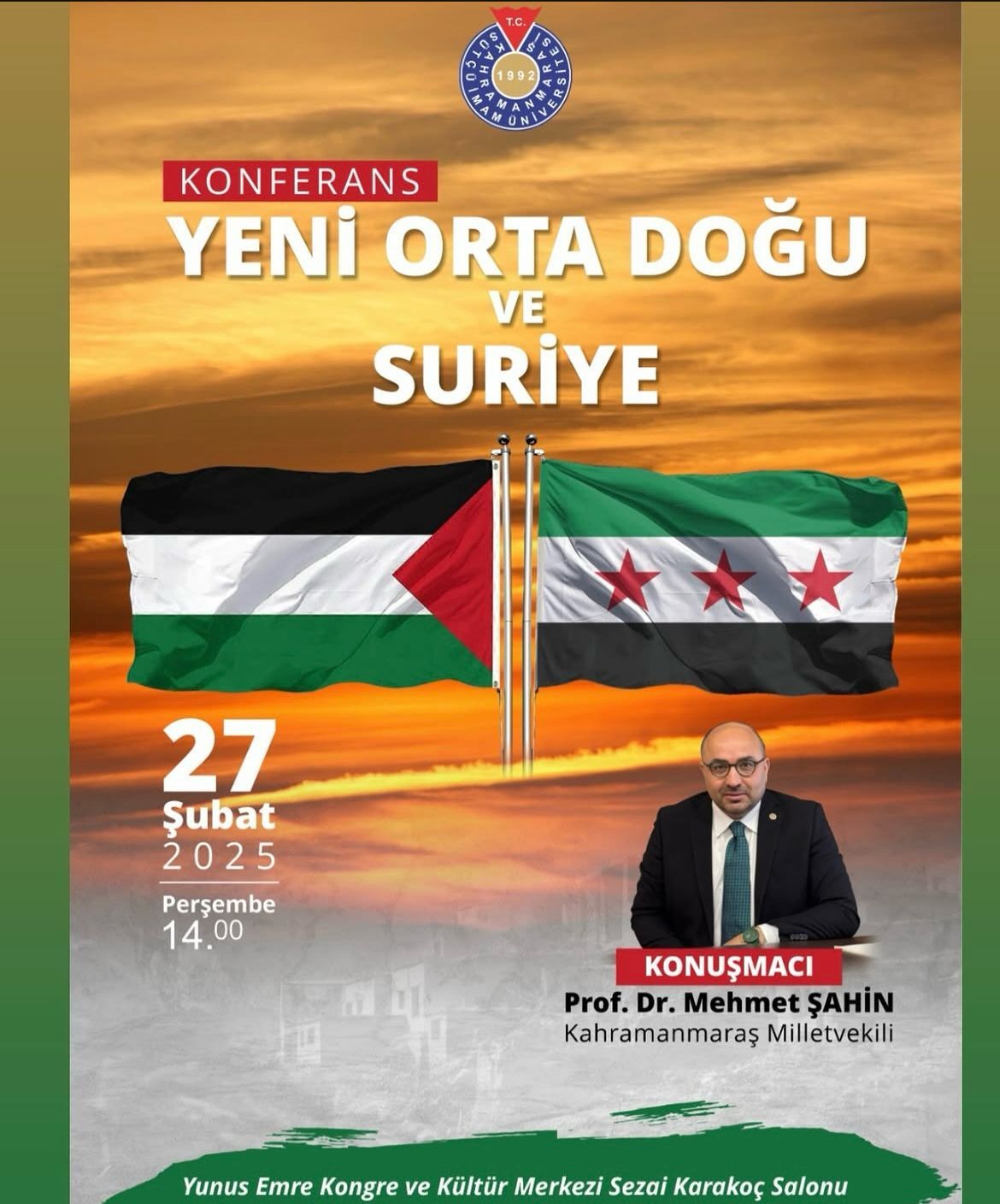Kahramanmaraş Sütçü İmam Üniversitesi (KSÜ) Yunus Emre Kongre ve Kültür Merkezi’nde düzenlenecek konferansta, Orta Doğu’daki güncel gelişmeler ve Suriye’deki son durum ele alınacak.