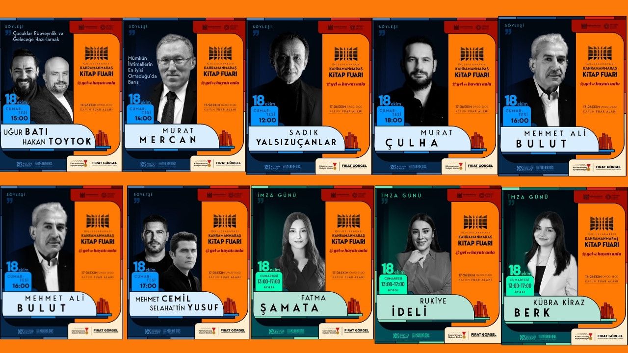 Kahramanmaraş Büyükşehir Belediyesi’nin ev sahipliğinde düzenlenen 10. Uluslararası Kahramanmaraş Kitap Fuarı, ikinci gününde de edebiyatseverleri önemli buluşmalara davet ediyor. 18 Ekim Cumartesi günü KAFUM’da gerçekleşecek etkinlikler, ziyaretçilere gün boyu kültür ve düşünce dolu bir program sunacak.