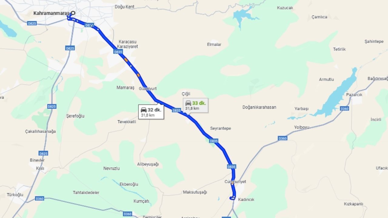 Kahramanmaraş şehir merkezinden, Pazarcık ilçesine bağlı Narlı Mahallesi’ne olan mesafe 30 kilometredir. Özel araçla yapılan yolculuk, trafiğin yoğunluğuna ve yol durumuna göre ortalama 35 – 40 dakika sürmektedir. Kısa mesafe olması nedeniyle sık kullanılan bir güzergâh olan bu rota, şehir içi ulaşımda da önemli bir yere sahiptir.