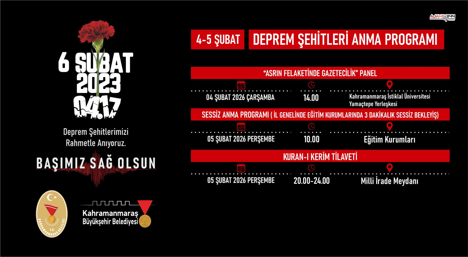 Programların ilk günü olan 4 Şubat Çarşamba günü, saat 14.00’te Kahramanmaraş İstiklal Üniversitesi Yamaçtepe Yerleşkesi’nde “Asrın Felaketinde Gazetecilik” başlıklı panel düzenlenecek. Panelde, kriz dönemlerinde basının rolü ve toplumsal hafızanın inşasında medya etkisi, uzman isimlerin katılımıyla ele alınacak.