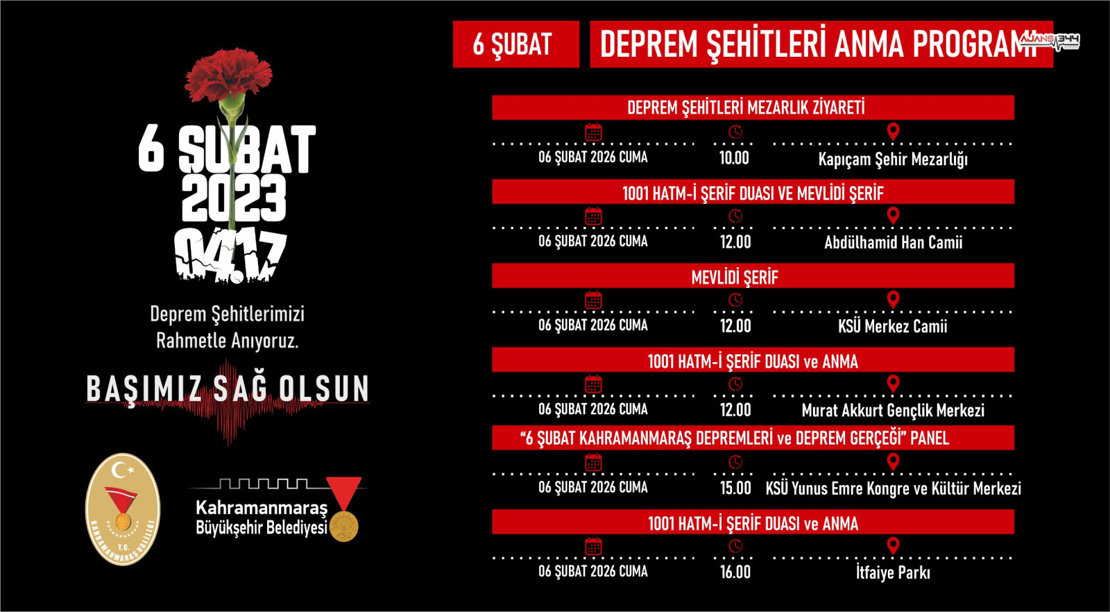6 Şubat Cuma, depremin yıl dönümü ve anma programlarının merkezi günü olacak. Sabah saat 10.00’da Kapıçam Şehir Mezarlığı’nda deprem şehitleri için mezarlık ziyareti yapılacak. Ardından öğle saatlerinde, Abdulhamid Han Camii, Murat Akkurt Gençlik Merkezi ve KSÜ Merkez Camii'nde Mevlid-i Şerif ve 1001 Hatm-i Şerif duası düzenlenecek.