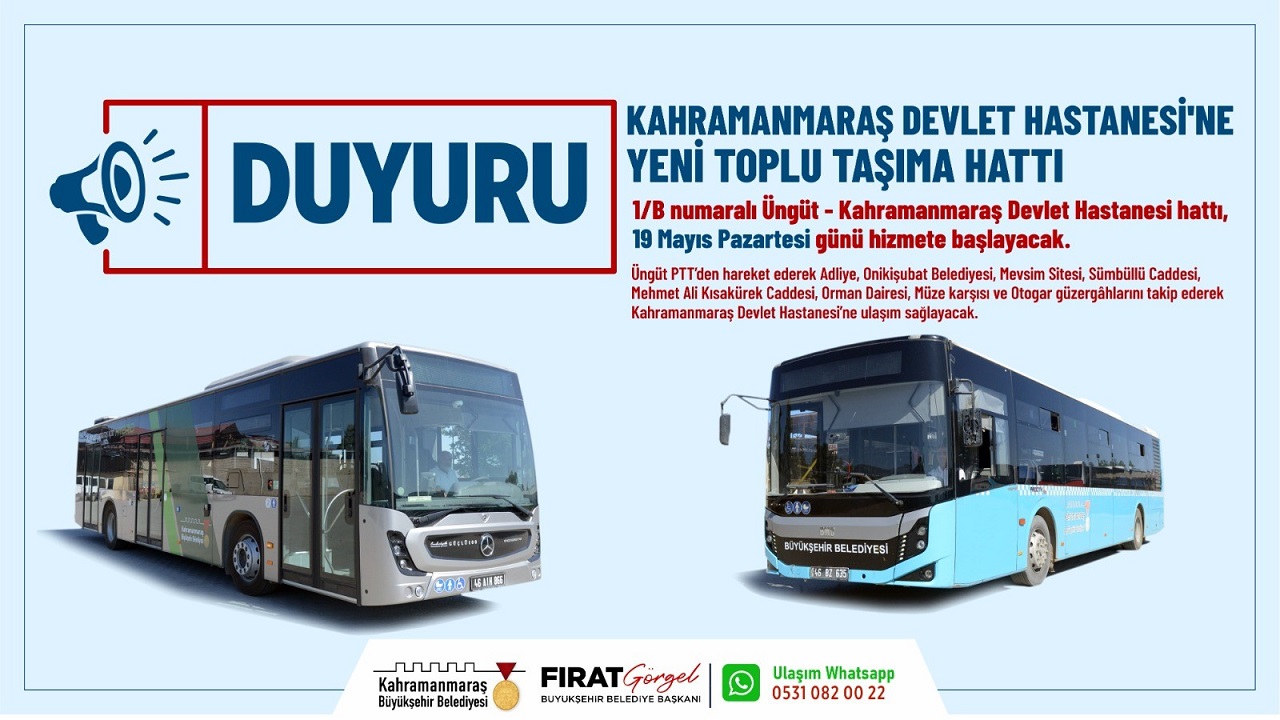 Üngüt PTT’den hareket edecek olan 1/B hattı; Adliye, Onikişubat Belediyesi, Mevsim Sitesi, Sümbüllü Caddesi, Mehmet Ali Kısakürek Caddesi, Orman Dairesi, Müze karşısı ve Otogar gibi yoğun kullanılan duraklardan geçerek Kahramanmaraş Devlet Hastanesi’ne ulaşım sağlayacak. Böylece, sadece hastaneye gitmek isteyenler değil, güzergâh üzerindeki mahallelerde yaşayan vatandaşlar da bu hizmetten faydalanabilecek. Yapılan açıklamada, vatandaşların, 1/B numaralı hattın güzergâhı ve araç hareket saatleri hakkında detaylı bilgilere https://kahramanmaras.bel.tr/toplu-tasima-guzergah-ve-saatleri internet adresinden ulaşabileceği belirtildi. Ayrıca vatandaşların toplu taşımaya ilişkin her türlü soru ve görüşlerini iletebilecekleri 0531 082 00 22 numaralı WhatsApp danışma hattının da aktif olduğu vurgulandı.