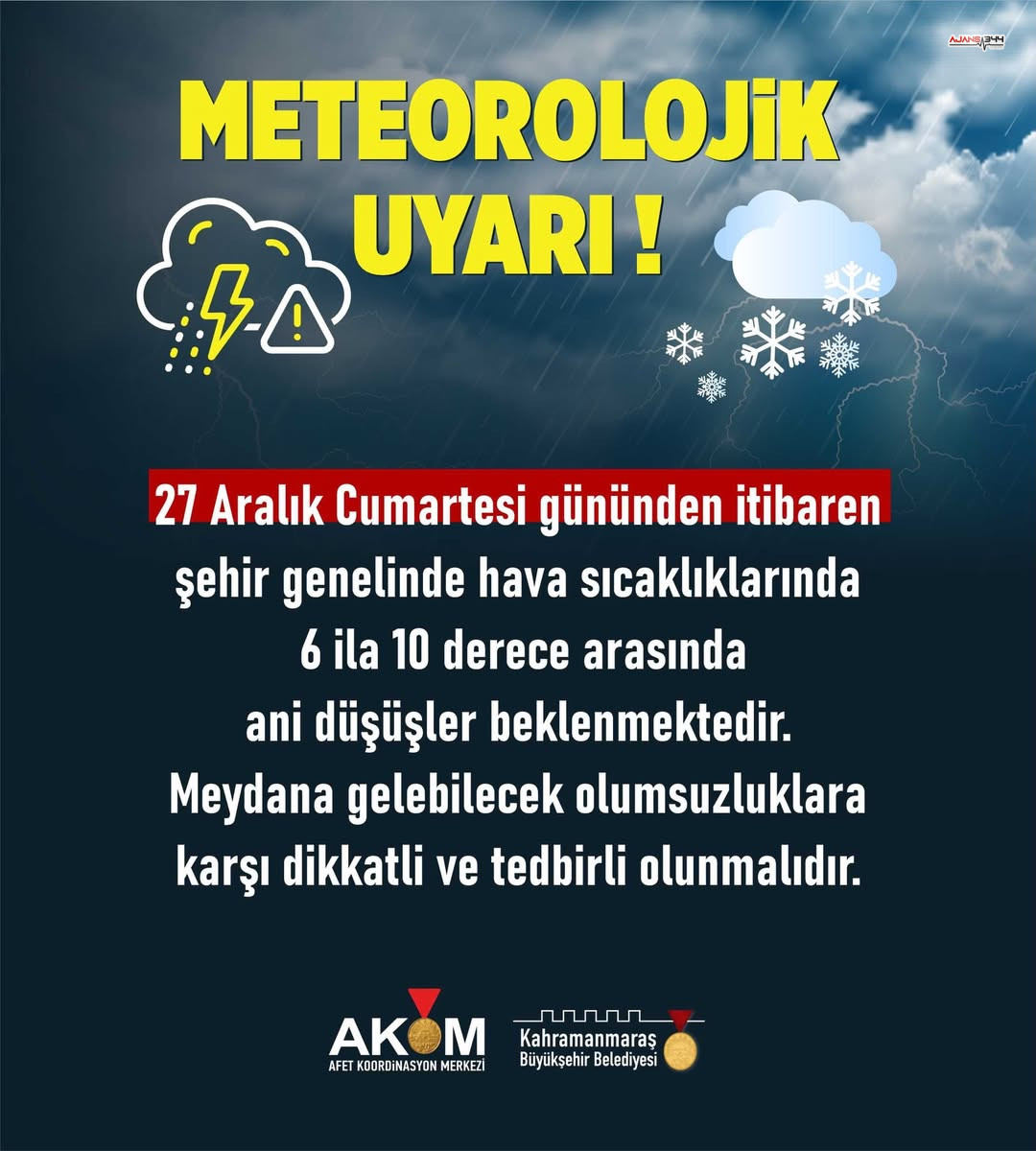 Kahramanmaraş'ta 27 Aralık Cumartesi gününden itibaren şehir genelinde hava sıcaklıklarında ani düşüşler yaşanacak. Büyükşehir Belediyesinin paylaşımına göre, sıcaklıkların 6 ila 10 derece arasında düşeceğini ve vatandaşların dikkatli olması gerektiğini bildirdi.