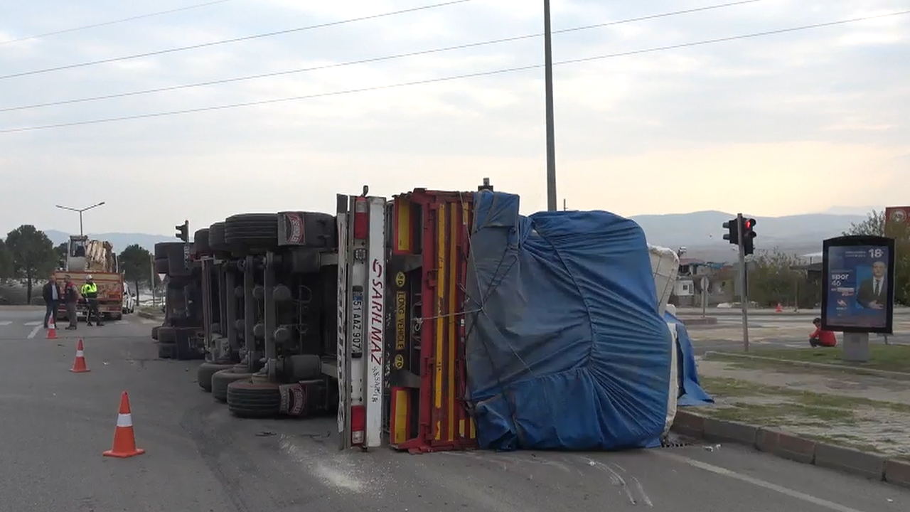 Kahramanmaraş'ın Onikişubat ilçesine bağlı Ağcalı Kavşağı'nda meydana gelen bir kazada, yüklü bir TIR kontrolden çıkarak devrildi. Olay yerine sevk edilen polis ve yardım ekipleri, yaptığı ilk incelemelerde şans eseri sürücünün yara almadığını tespit etti. Ancak, devrilen tırın yolu büyük ölçüde kapatması nedeniyle bölgede uzun süre trafik akışı sağlanamadı.