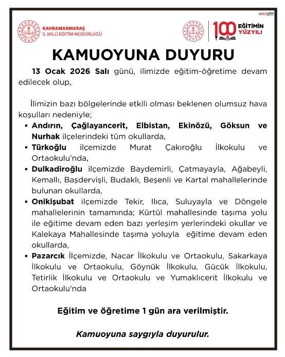 Açıklamada, Andırın, Çağlayancerit, Elbistan, Ekinözü, Göksun ve Nurhak ilçelerindeki tüm resmi ve özel okullarda eğitime ara verildiği bildirildi. Türkoğlu ilçesinde Murat Çakıroğlu İlkokulu ve Ortaokulu, Dulkadiroğlu ilçesinde ise Baydemirli, Çatmayayla, Ağabeyli, Kemallı, Başdervişli, Budaklı, Beşenli ve Kartal mahallelerindeki okullar tatil kapsamına alındı.