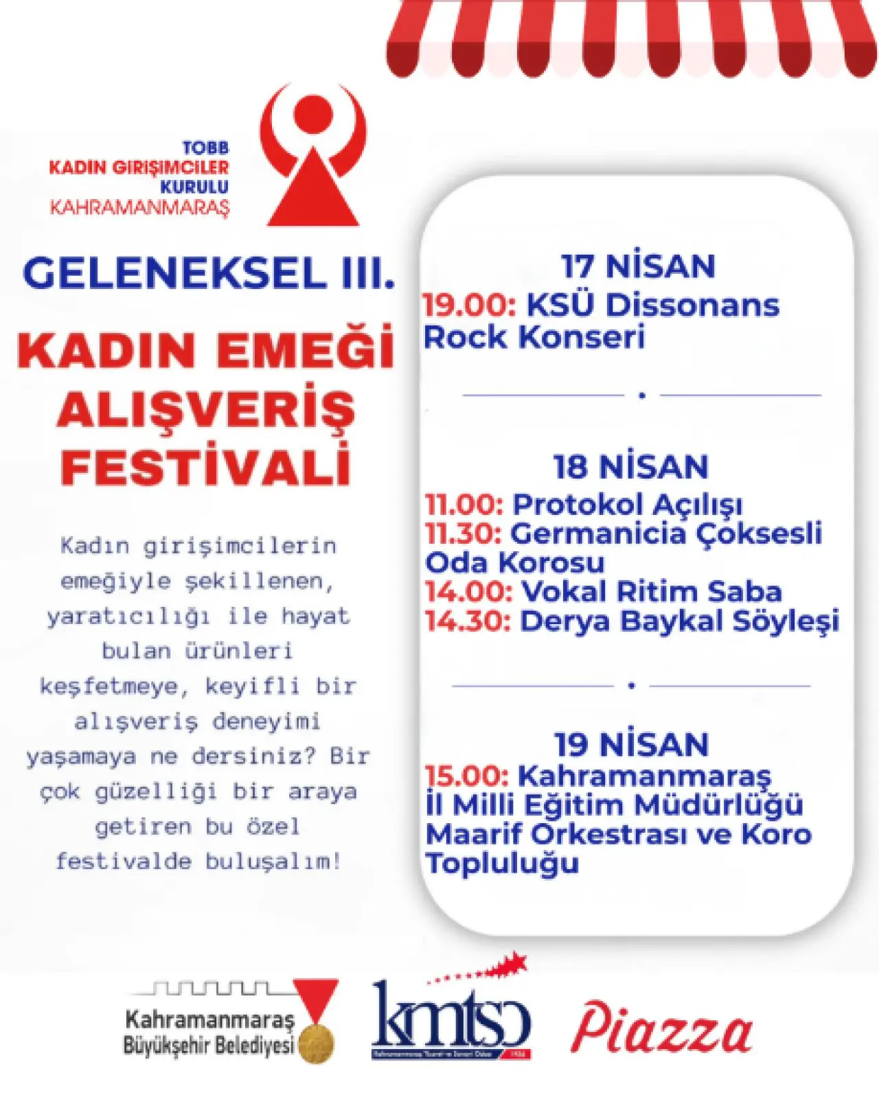 TOBB Kahramanmaraş Kadın Girişimciler Kurulu öncülüğünde düzenlenen Geleneksel III. Kadın Emeği Alışveriş Festivali, 17-19 Nisan tarihleri arasında gerçekleştirilecek. Festivalde kadın girişimcilerin el emeğiyle hazırladığı ürünler ziyaretçilerin beğenisine sunulacak. Etkinlik kapsamında, katılımcılara hem alışveriş hem de sosyal etkileşim imkânı sağlayan geniş bir program hazırlandı.