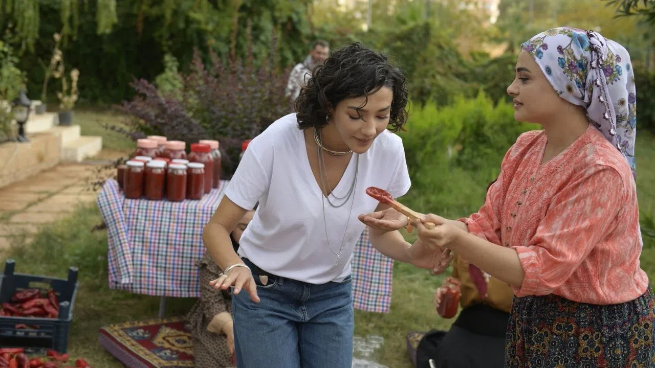 Dizinin çekimlerindeki bu sahne renkli görüntülere sahne oldu. İstanbul'dan kalkıp, kocasının peşinde Urfa'ya gelen ve alışmadığı çok farklı bir ortamda güç mücadelesinin tam da orta yerine düşen Melek'e ( Aybüke Pusat) konağın kadınları salça nasıl yapılır dersi verdiler.