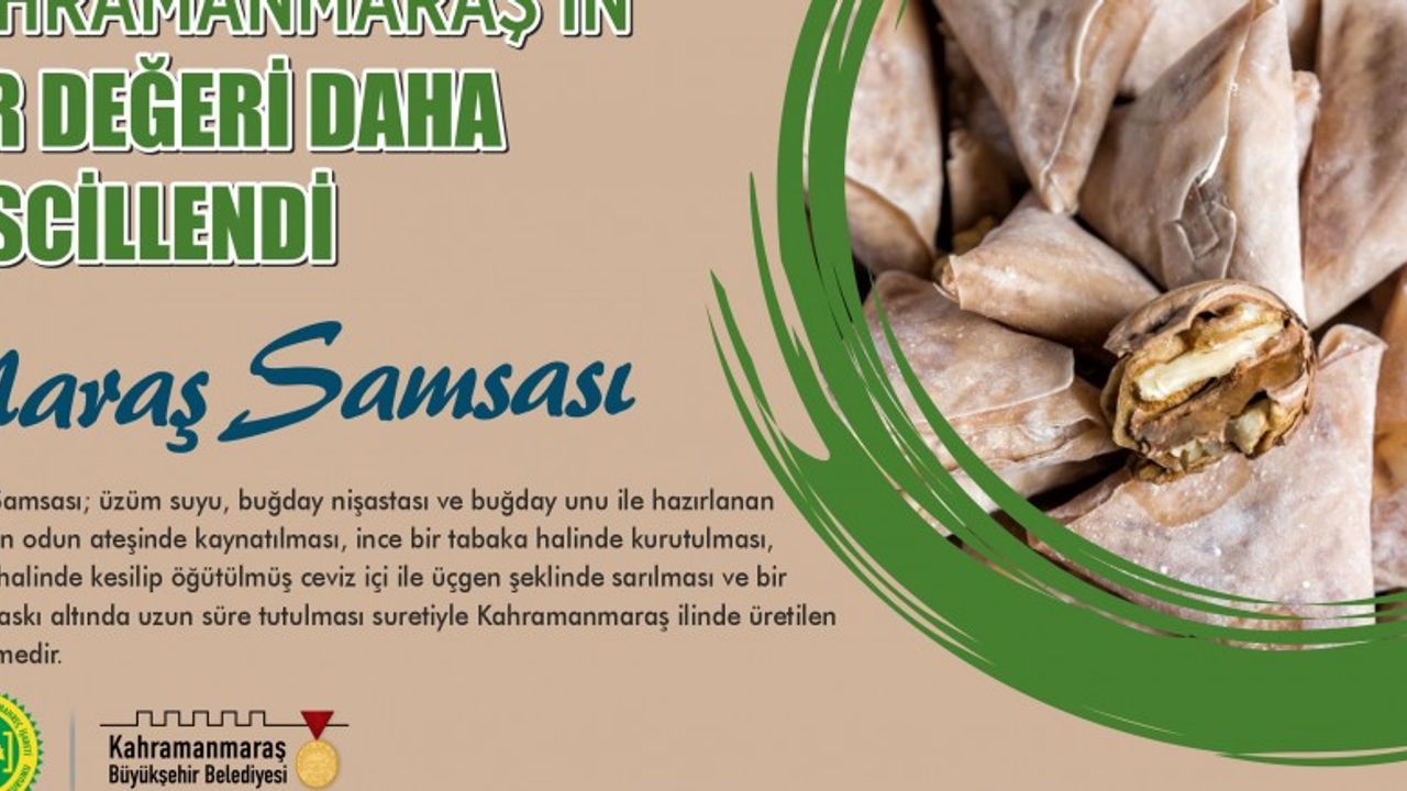Şehrin yöresel lezzetlerini, geleneksel el sanatlarını ve kültürel değerlerini koruma altına almak için tescil başvurularını sürdüren Kahramanmaraş Büyükşehir Belediyesi, şehrin mutfak kültüründe önemli bir yere sahip olan Maraş Samsası’nı da Türk Patent ve Marka Kurumu’na tescil ettirdi. Büyükşehir Belediyesi, Sütçü İmam Üniversitesi Teknik Bilimler Meslek Yüksekokulu Gıda İşleme Bölümü ve İl Tarım ve Orman Müdürlüğü iş birliğiyle yapılan başvurunun ardından Maraş Samsası, Türk Patent ve Marka Kurumu tarafından yapılan incelemelerin ardından hazırlanan 143 Sayılı Resmi Coğrafi İşaret ve Geleneksel Ürün Adı Bülteni'nde yayımlanarak şehrin koruma altındaki ürünleri arasında yerini aldı. Mahalle Tarım ve Hayvancılık Dairesi Başkanlığı’ndan yapılan açıklamada, şehrin yöresel lezzetleri ve el sanatlarına sahip çıkılarak coğrafi işaret tescilli ürünlerin sayısının artırılacağı belirtildi.