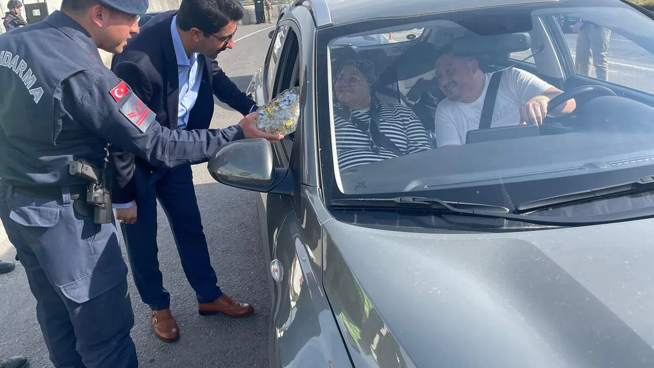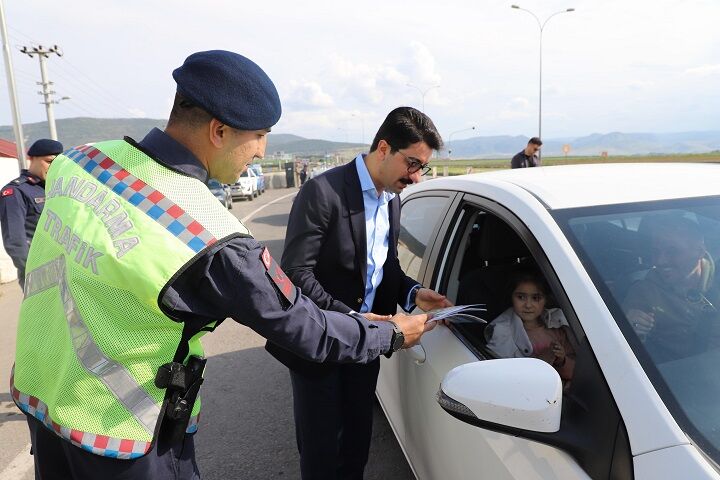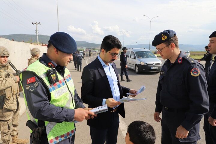 Bayram öncesinde artan trafik yoğunluğu nedeniyle sürücüleri dikkatli olmaları konusunda uyaran ekipler, ailelerin bayramını kutlayarak kendilerine bayramlık çikolata ikram etti ve trafik kurallarına ilişkin bilgi broşürü dağıttı.