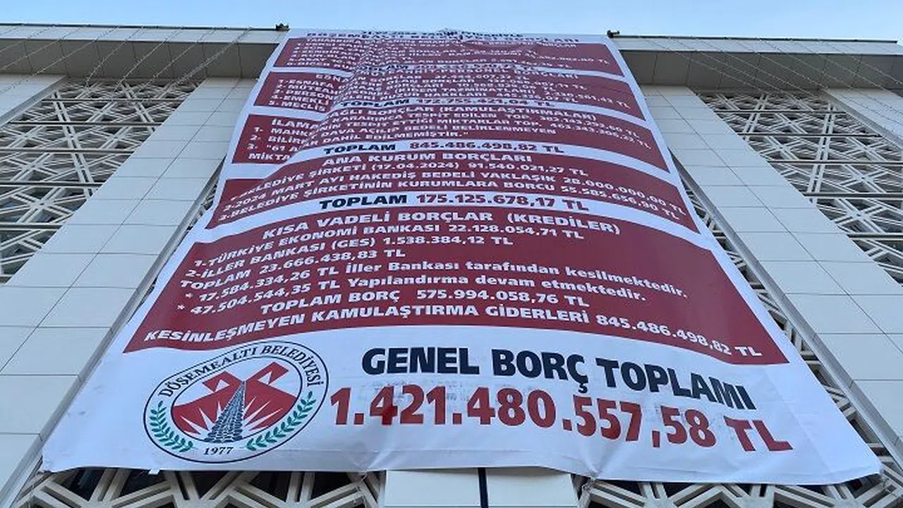 31 Mart seçimlerinde Döşemealtı Belediyesi kazanan CHP'li Menderes Dal ve yönetimi, kendilerinden önce iki dönem belediyeyi yöneten yine CHP'li Başkan Turgay Genç ve yönetiminden devraldıkları mali tablonun bulunduğu pankartı belediye binasının girişine astı.