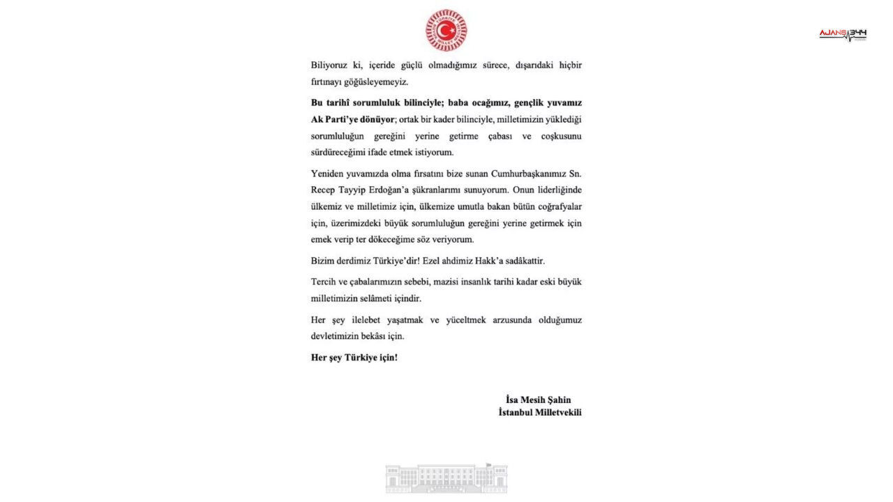 Katılımlardan biri, milletvekili İsa Mesih Şahin tarafından resmen doğrulandı. Şahin, sosyal medya hesabından yaptığı açıklamada, "Yuvaya dönüş vakti..." ifadelerini kullanarak AK Parti'ye döndüğünü duyurdu. Açıklamasında, güçlü Türkiye hedefi için birlikte mücadele etme gerekliliğine vurgu yaptı ve Cumhurbaşkanı Erdoğan'a teşekkür etti.