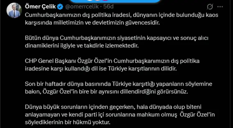 AK Parti Genel Başkan Yardımcısı ve Parti Sözcüsü Ömer Çelik, Cumhurbaşkanı'nın dış politika iradesine yönelik eleştirilerde bulunan CHP Genel Başkanı Özgür Özel'e tepki gösterdi.