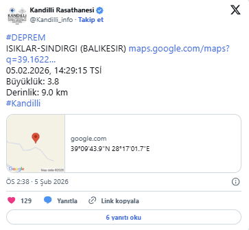 Afet ve Acil Durum Yönetimi Başkanlığı (AFAD) ise depremin büyüklüğünü 3.5 olarak açıkladı. Her iki kurum da sarsıntının merkez üssünü Sındırgı olarak işaretledi.
