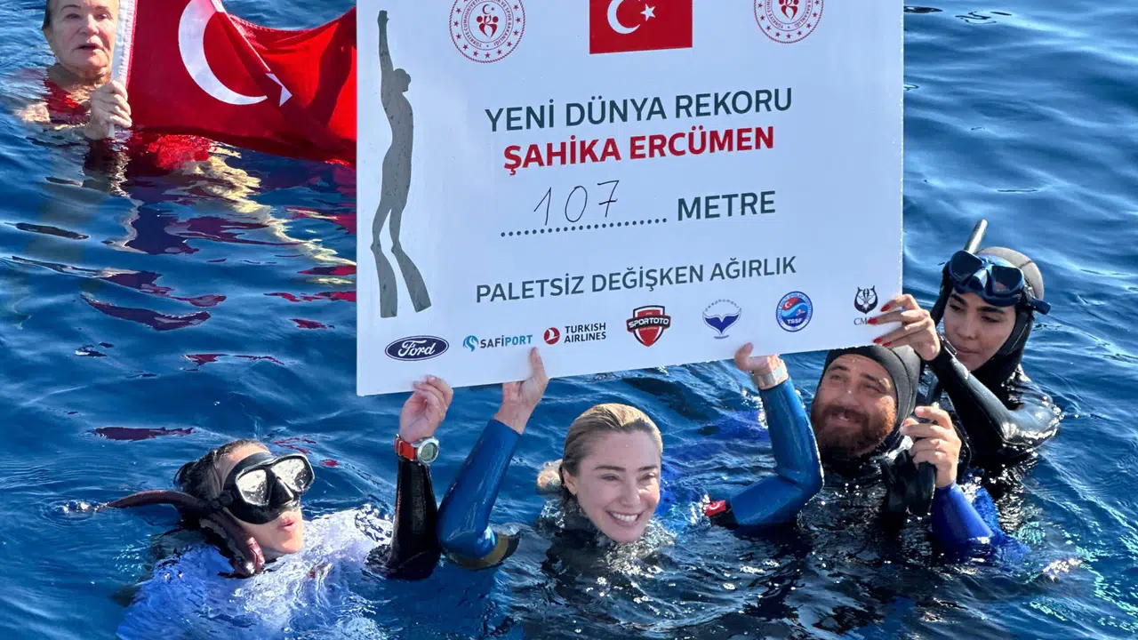 Milli dalışçı, Birleşmiş Milletler 'Sudaki Yaşam' Savunucusu ve Spor Toto Spor Kulübü sporcusu Şahika Ercümen, Gazze'ye dayanışma mesajı vermek amacıyla Antalya Kaş'ta gerçekleşen tarihi dalışta, değişken ağırlık paletsiz kategoride 107 metreye ulaşarak 3 dakika 21 saniyede dünya rekorunu kırdı!