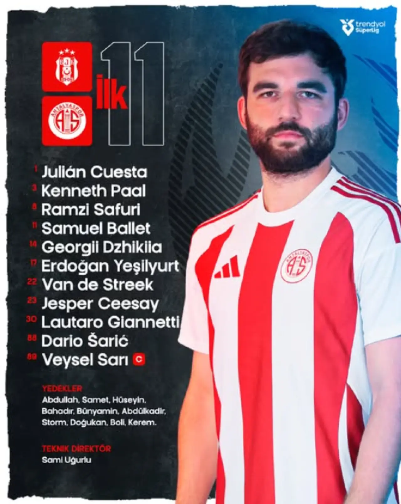 Konuk ekip Antalyaspor’da ise kaleyi Julián Cuesta korudu. Savunma hattında Van de Streek ve Dzhikiya gibi isimler görev alırken, orta sahada Erdoğan Yeşilyurt ve Ramzi Safuri forma giydi. Hücum hattında ise Samudio ve Larsson’un etkili olması beklendi.