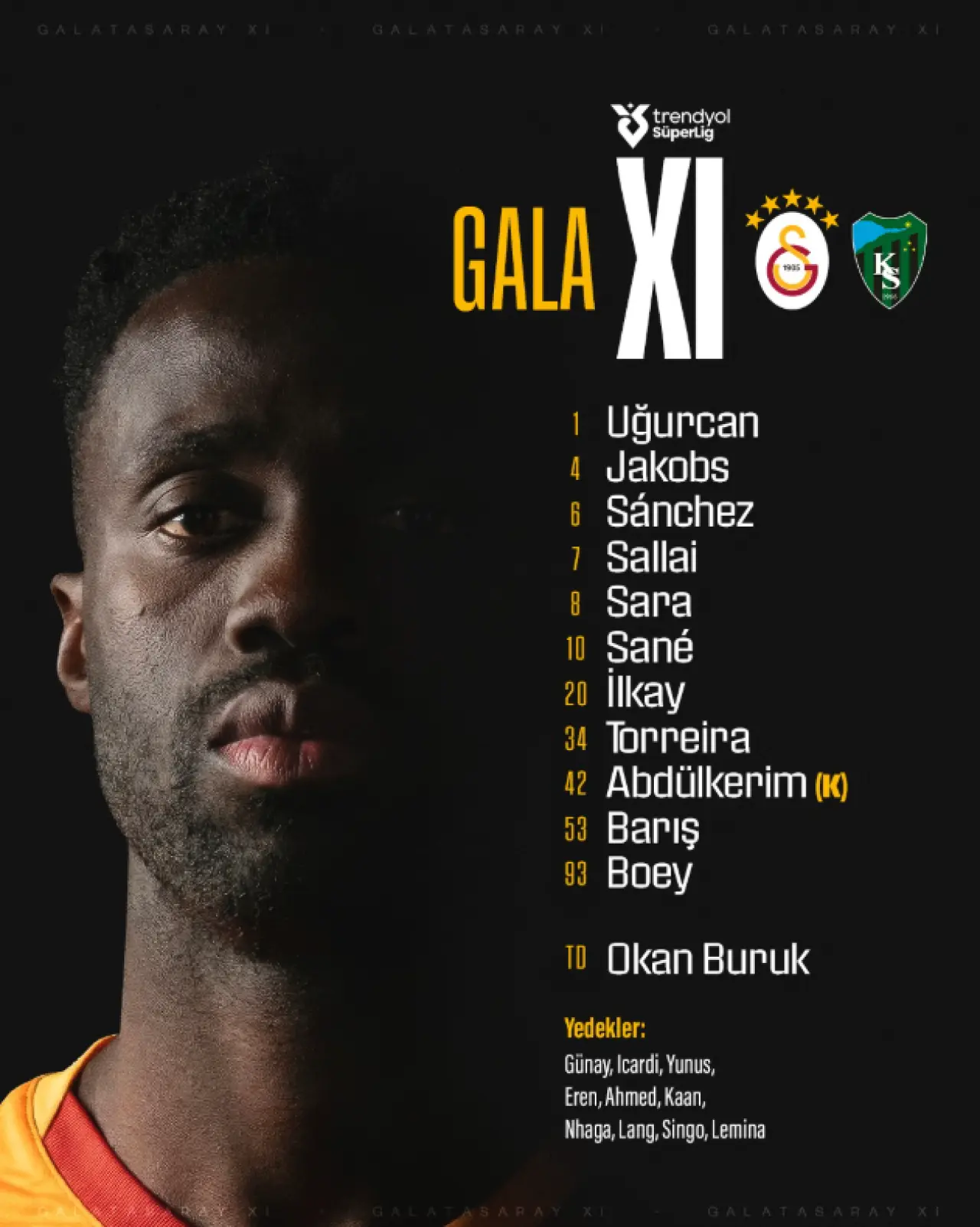 Galatasaray sahaya; Uğurcan, Boey, Davinson, Abdülkerim, Jakobs, İlkay, Torreira, Sane, Sara, Sallai ve Barış ilk 11’i ile çıktı.