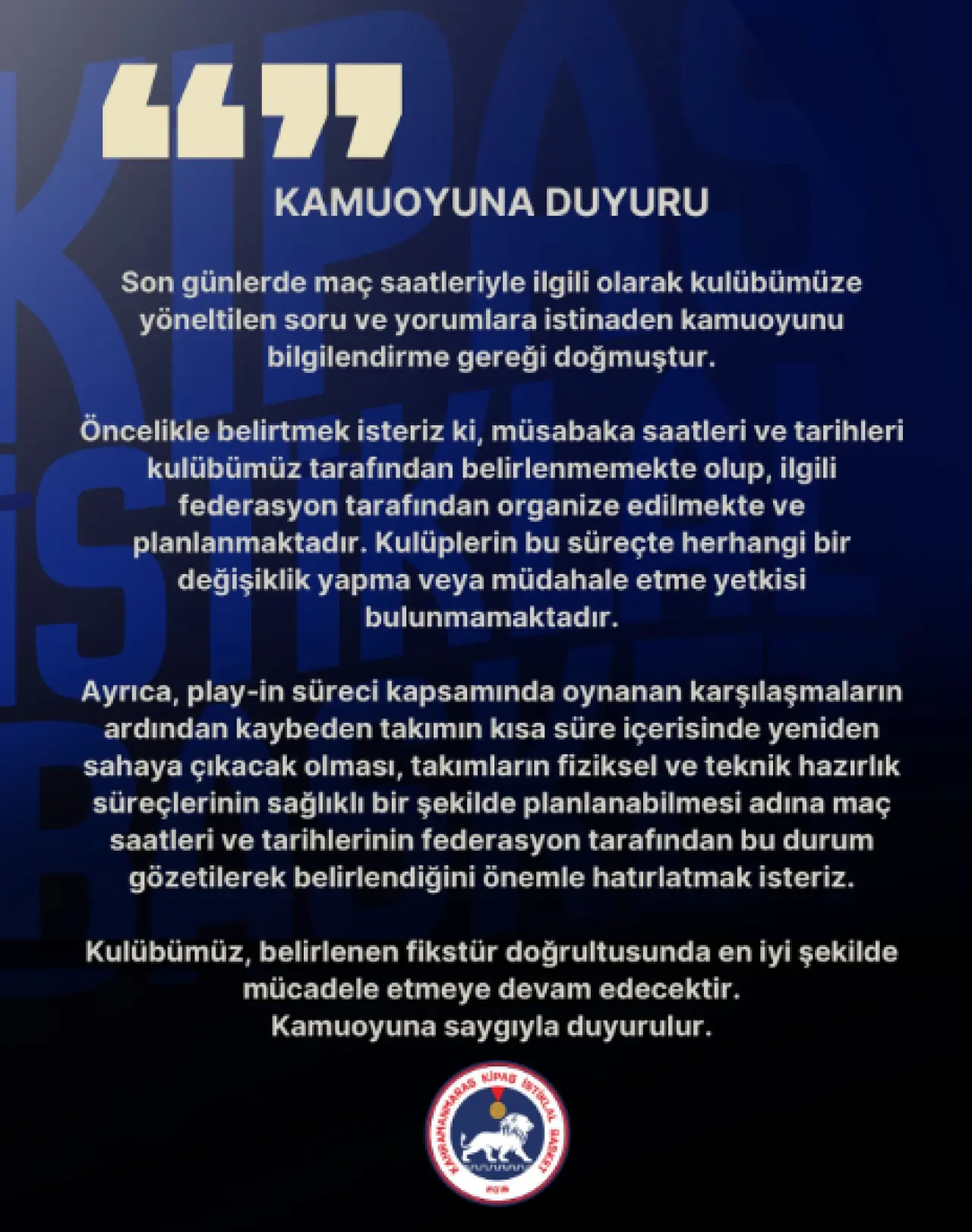 Kipaş İstiklal Basketbol Kulübü, son günlerde kamuoyunda gündem olan maç saatleriyle ilgili tartışmalara yönelik resmi bir açıklama yaptı. Kulüp tarafından yapılan duyuruda, karşılaşma saatleri ve tarihlerinin kulüp inisiyatifinde olmadığı açık şekilde ifade edildi.