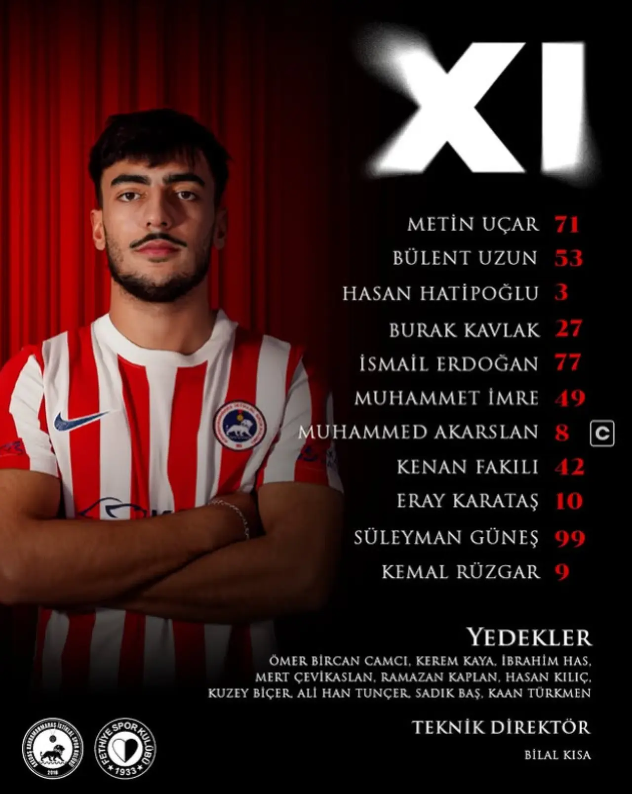 Ev sahibi ekip Kahramanmaraş İstiklalspor, sahaya Metin Uçar kalede olmak üzere şu isimlerle çıkacak: Hıfsullah İsmail Erdoğan, Burak Kavlak, Hasan Hatipoğlu, Bülent Uzun, Muhammet İmre, Muhammed Akarslan, Kenan Fakılı, Hüseyin Eray Karataş, Kemal Rüzgar ve Süleyman Güneş.