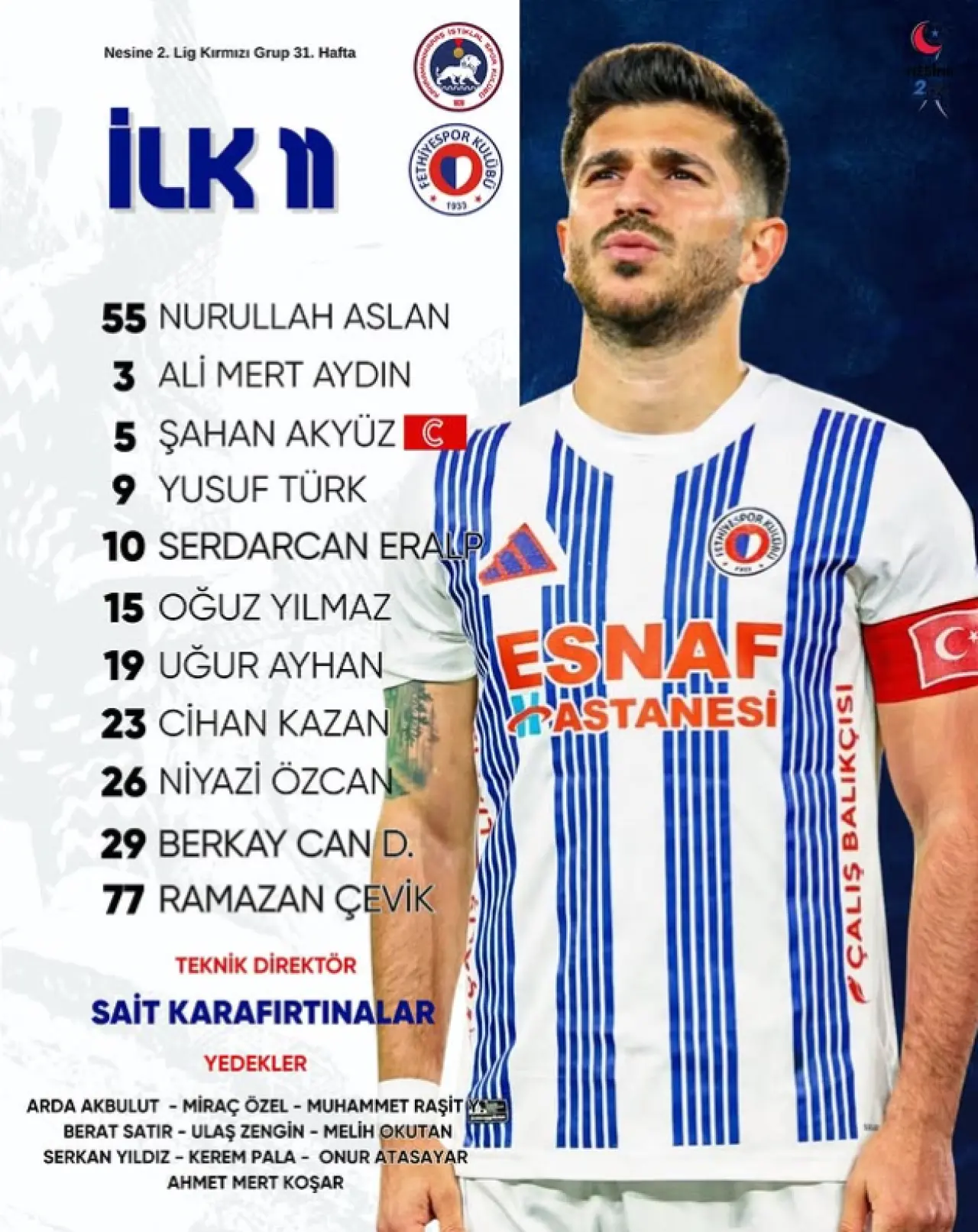 Konuk ekip Fethiyespor ise mücadeleye Nurullah Aslan’ın kalede olduğu kadroyla çıkacak. Sahada yer alacak diğer isimler Ali Mert Aydın, Şahan Akyüz, Oğuz Yılmaz, Seyit Niyazi Özcan, Cihan Kazan, Uğur Ayhan, Serdarcan Eralp, Berkay Can Değirmencioğlu, Ramazan Çevik ve Yusuf Türk oldu.