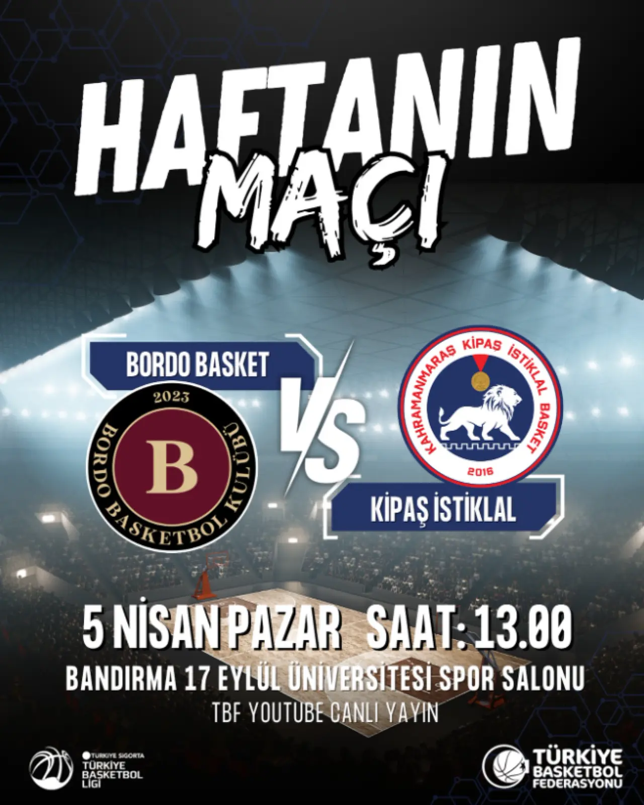 Kahramanmaraş temsilcisimiz Kipaş İstiklalspor, Türkiye Basketbol Ligi’nde haftanın önemli karşılaşmalarından birinde deplasmanda Bordo Basket ile karşı karşıya gelecek. Kritik mücadelede temsilcimiz, puan arayışıyla sahaya çıkacak.