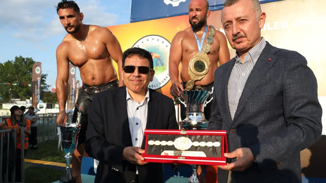 Kocaeli Büyükşehir Belediye Başkanı Tahir Büyükakın, 17. Sekapark Altın Kemer Yağlı Güreşleri’nde rakibi Mustafa Taş’ı yenerek başpehlivan olan Orhan Okulu’ya altın kemerini taktı, tebrik etti.