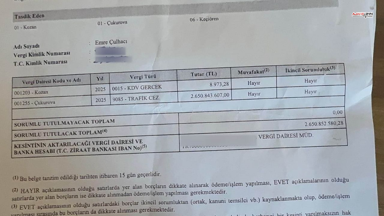 Adana’nın Kozan ilçesinde yaşayan Avukat Emre Çulhacı, resmi işlemler sırasında adına 2 milyar 650 milyon 843 bin 607 lira tutarında trafik cezası kaynaklı vergi borcu göründüğünü öğrenince büyük bir şaşkınlık yaşadı. Türkiye genelinde bir yılda kesilen toplam trafik cezalarının önemli bir bölümüne denk gelen bu rakam, kısa sürede dikkat çekti.