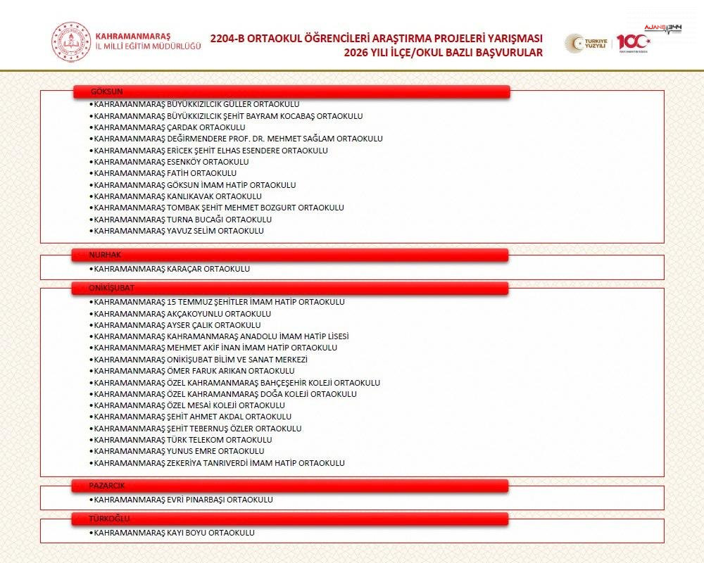 Hazırlanan listeler, sadece merkez ilçelerle sınırlı kalmayan bir proje hareketliliğine işaret etti. Göksun, Onikişubat, Dulkadiroğlu, Pazarcık, Türkoğlu ve Nurhak başta olmak üzere birçok ilçeden farklı okulların yarışmalara başvuru yaptığı kaydedildi. Bu tablo, bilimsel çalışmaların il genelinde tabana yayıldığını ortaya koydu.