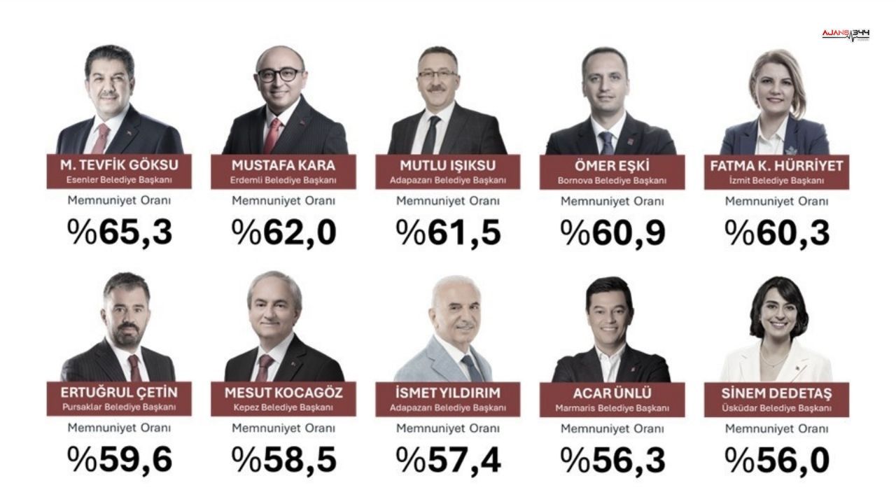 Araştırma sonuçlarına göre Tevfik Göksu yüzde 65.3 ile birinci sırada yer aldı. Mustafa Kara yüzde 62 ile ikinci, Mutlu Işıksu ise yüzde 61.5 ile üçüncü oldu. Kepez Belediye Başkanı Mesut Kocagöz, yüzde 58.5'lik memnuniyet oranıyla yedinci sırada bulundu.
