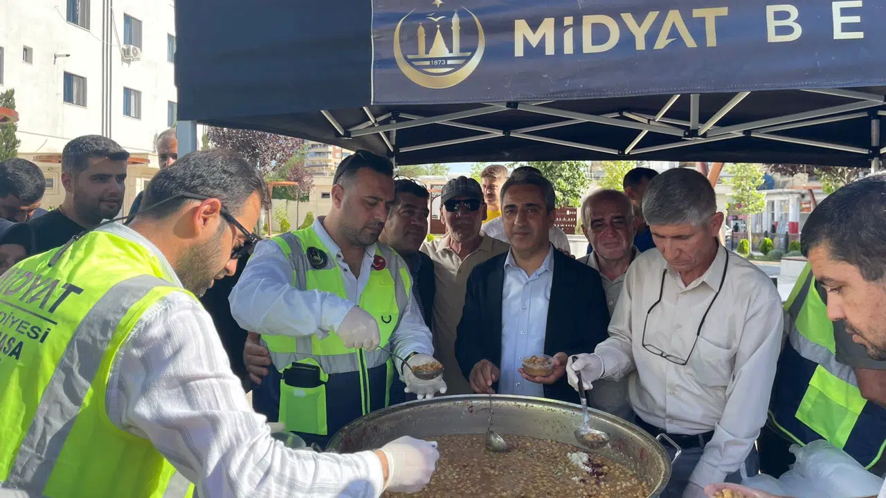 Midyat Belediyesi tarafından düzenlenen etkinlik kapsamında, Recep Tayyip Erdoğan Parkı, Kuyumcular Çarşısı ve Millet Bahçesi önünde kurulan stantlarda vatandaşlara aşure dağıtıldı.